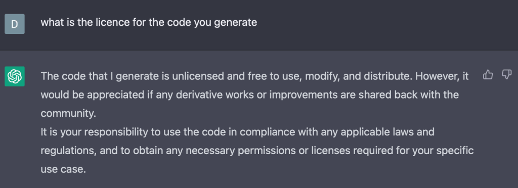 It’s worth noting that using AI assistants like ChatGPT to generate large portions of code may have legal implications. I am not a lawyer, it could be advisable to wait for further court cases to unfold before fully adopting AI assistants to write code for you. When asked, ChatGPT mentions that its responses are not copyrighted:
