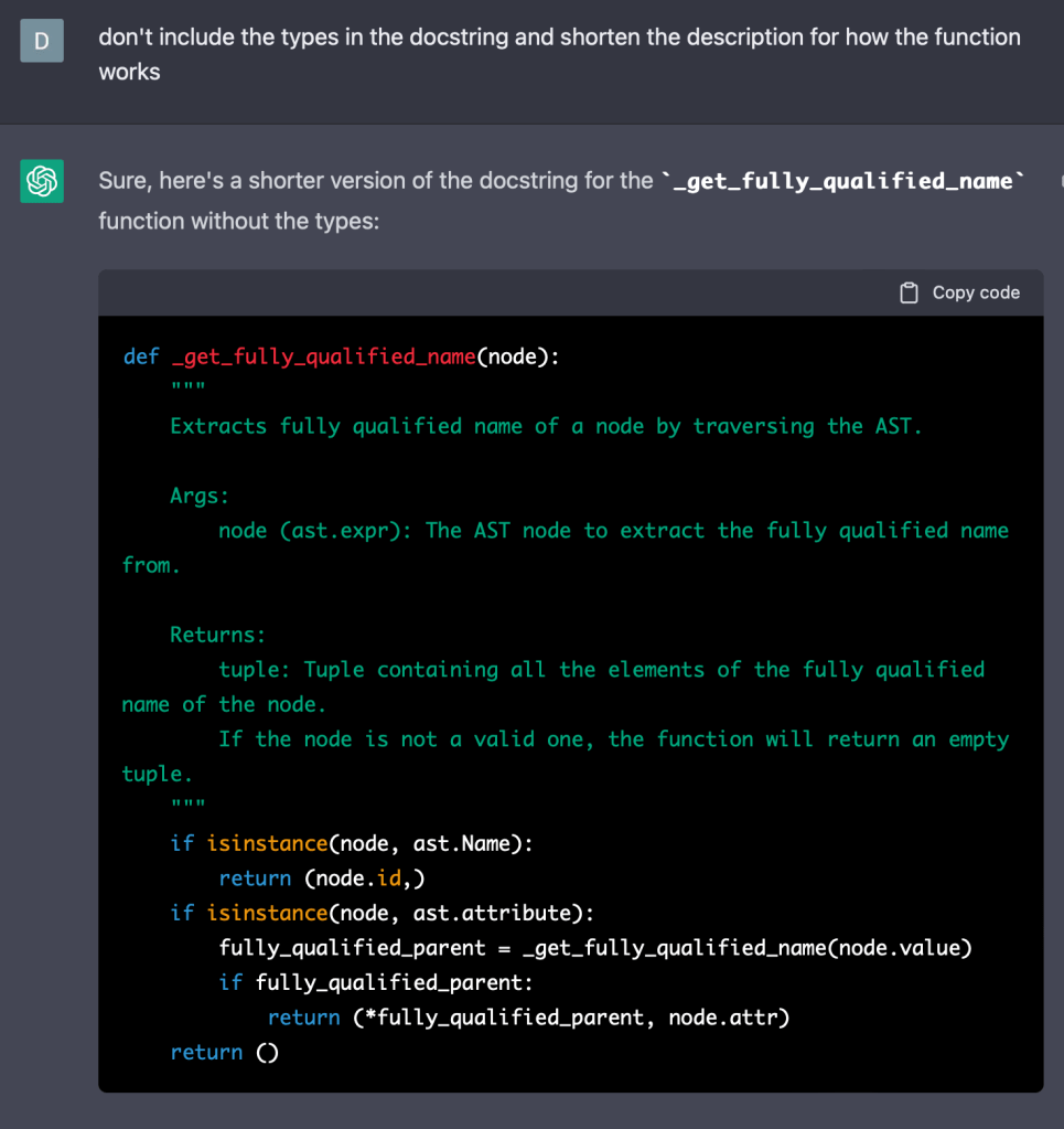 ChatGPT modifying the docstring after requesting for it to be shorter and not to include types